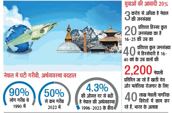 नेपाल में गरीबी घटी है लेकिन अर्थव्यवस्था की सुस्त रफ्तार की वजह से देश में नौकरियां नहीं पैदा हुईं। खेती के अलावा दूसरे क्षेत्रों में रोजगार के अवसर नहीं बढ़े। देश में गरीबी कम होने के पीछे भी सरकार के स्तर पर प्रयास नहीं बल्कि विदेश से नेपाली नागरिकों द्वारा भेजा जाने वाला पैसा है।